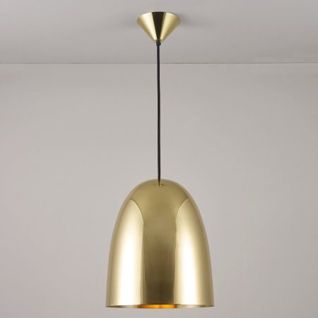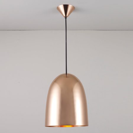 Pendant lamp for hardwiring into ceiling. Provides direct ambient illumination. Production Process:  The shade is lathe-spun into its distinct shape from a single sheet of aluminum.